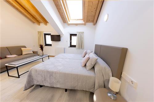 Apartamento Aitzulo (2+2 personas): Este luminoso apartamento de 62 metros cuadrados ubicado en la planta baja cuenta con una pequeña cocina americana totalmente equipada para que podáis cocinar cuando y como queráis. Está adaptado para personas con movilidad reducida. El comedor consta de TV plana y sofá cama para dos personas. El dormitorio al que se accede desde el salón, tiene una cama de matrimonio y un amplio armario ropero. Al baño completamente adaptado se accede directamente desde la habitación.