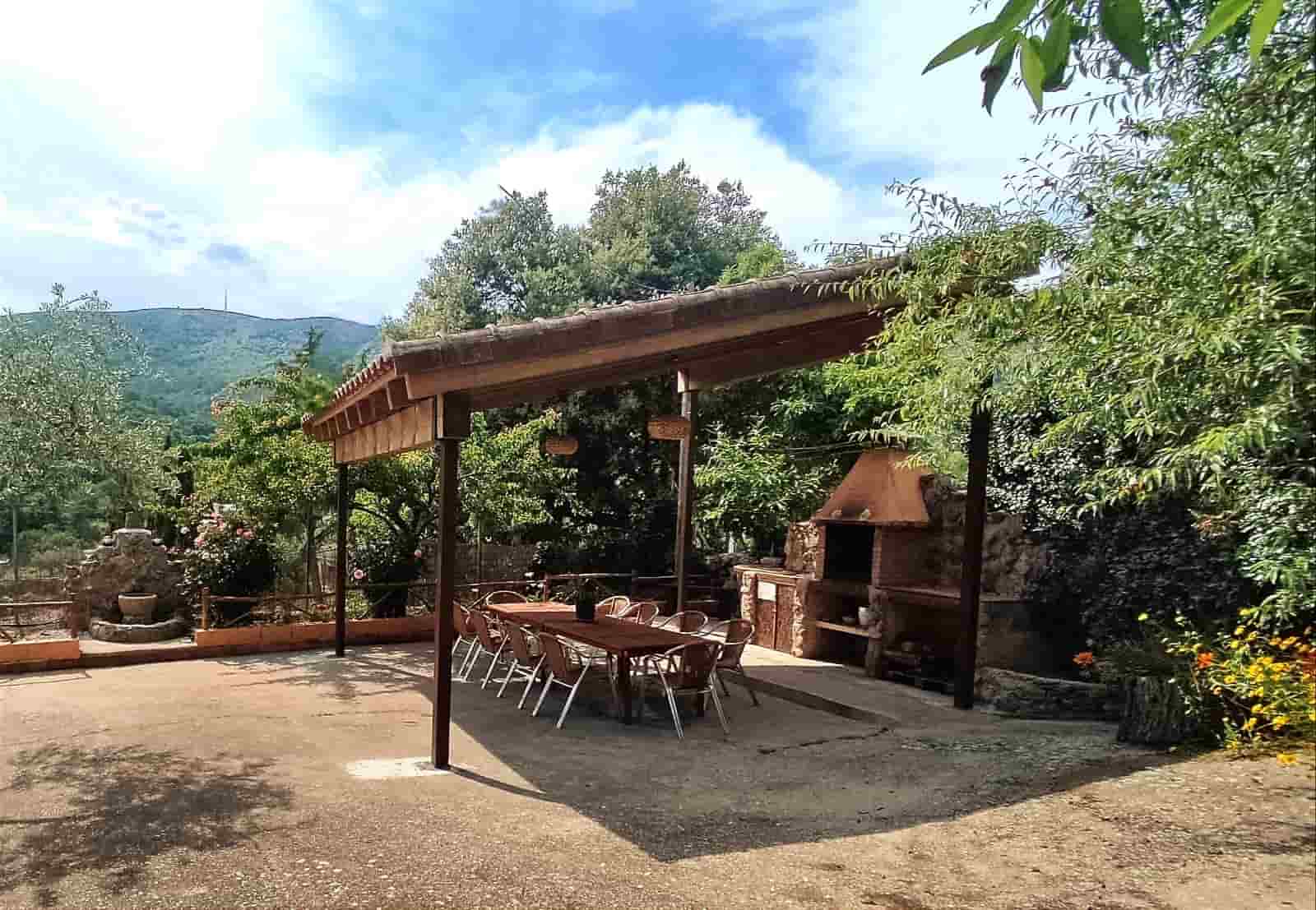 La casa cuenta con una finca de 1200 metros cuadrados con árboles frutales, fuentes, barbacoa, muebles de jardín, piscina con césped natural y vistas a las montañas. La casa tiene dos plantas con la siguiente distribución: