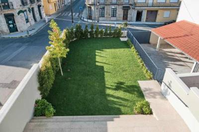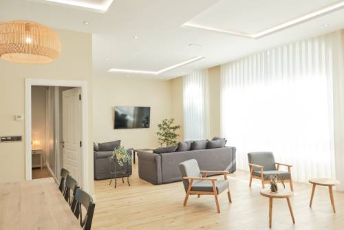 En la planta de abajo está el salón muy grande con tv 65" una cocina totalmente equipada (horno, nevera, microondas, cafetera, tostadora, exprimidora, fregaplatos, lavadora) y saliendo por la cocina un jardincito que lleva a un parking privado para 2 coches.