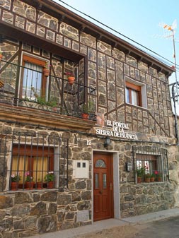 Al acercarnos a la casa, nos encontramos la fachada de la piedra típica serrana de pizarra, extraída manualmente de la peña y recortada posteriormente para su encaje en la pared. Levantando los ojos a la segunda planta, ésta se encuentra adornada con listones de madera de roble dibujando diversas formas antojadizas, lo que hace del conjunto una obra del pasado.