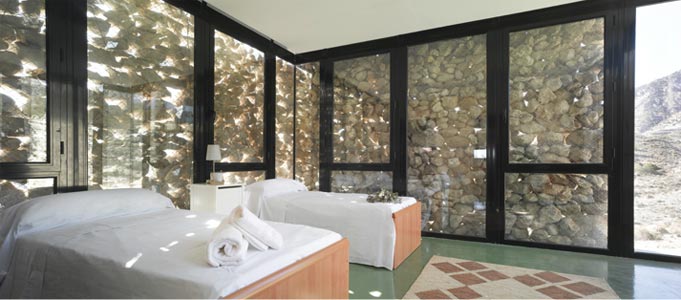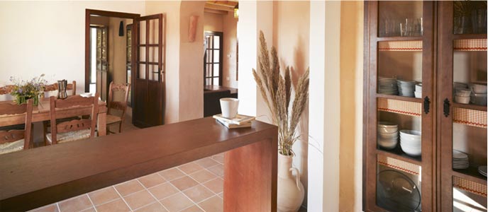 La casa está totalmente equipada para alojar a ocho personas. Tiene tres dormitorios, dos dobles y uno con capacidad para cuatro personas, dos cuartos de baño completos, cocina, comedor, salón-chimenea, salón-biblioteca y terraza. Cuenta también con un pequeño patio con horno moruno y una despensa. Dispone de lavadora, lavavajillas, horno, microondas, televisión, DVD, servivio Wi-Fi gratuito, equipo de música y botiquín completo. Hay calefacción y una chimenea grande para el invierno. Para los meses calurosos, la finca dispone de una piscina perfectamente integrada en el entorno, y desde la que se contempla la belleza de la Sierra de la Pila. Además en nuestra casa hay dos bicicletas para uso de nuestros huéspedes.