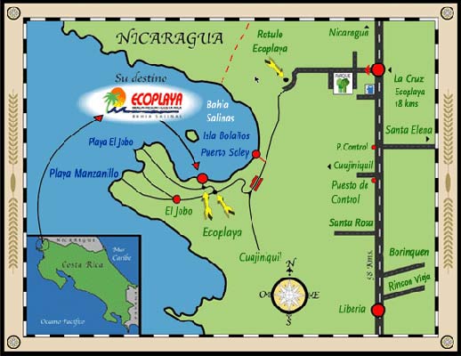 En Costa Rica se sigue Por la ruta 1 hacia Guanacaste y se toma hacia el pueblo de La Cruz, siguiendo hacia el área de Bahía Salinas, estamos ubicados antes de llegar al pueblo de Jobo, al frente de playa coyotera.