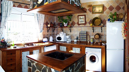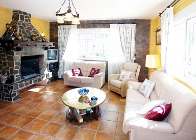 Salón y cocina "americana": Dispone de un salón-comedor con amplios ventanales. Se distribuye alrededor de una chimenea de piedra. Dispone de calefacción,Internet WIFI, TV, video, DVD, TV via satélite, equipo de música, karaoke, videojuego, piano... El salón continúa con la cocina, en forma de cocina americana (sin separación entre el salón y la cocina), en el centro de ella tenemos una isla con vitrocerámica y horno. Totalmente equipada: frigorífico, lavadora, lavavajillas, microondas, tostadora y todo tipo de pequeños electrodomésticos.