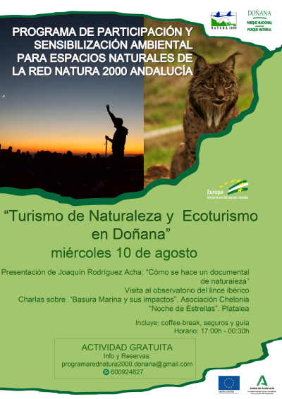 El próximo domingo 10 de agosto tendrá lugar en el Centro de Visitantes El Acebuche (Almonte), dentro del Parque Nacional de Doñana un programa de sensibilización y participación ambiental en la Red Naura 2000. El objetivo de estas jornadas es dar a conocer las posibilidades de conocer el espacio natural mediante los senderos de uso público de acceso libre, y a través de empresas de turismo de naturaleza y ecoturismo, por lo que todas serán gratuitas y contarán con un coffee-break, seguros y guía.