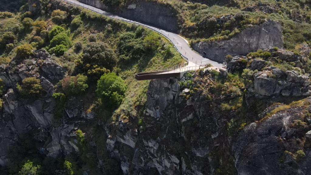 Este mirador de 12,8 metros de largo, permite a los visitantes tener la sensación de encontrarse suspendido sobre Arribes, mientras disfruta de las vistas de la presa de Aldeadávila // Crédito: Junta de Castilla y León