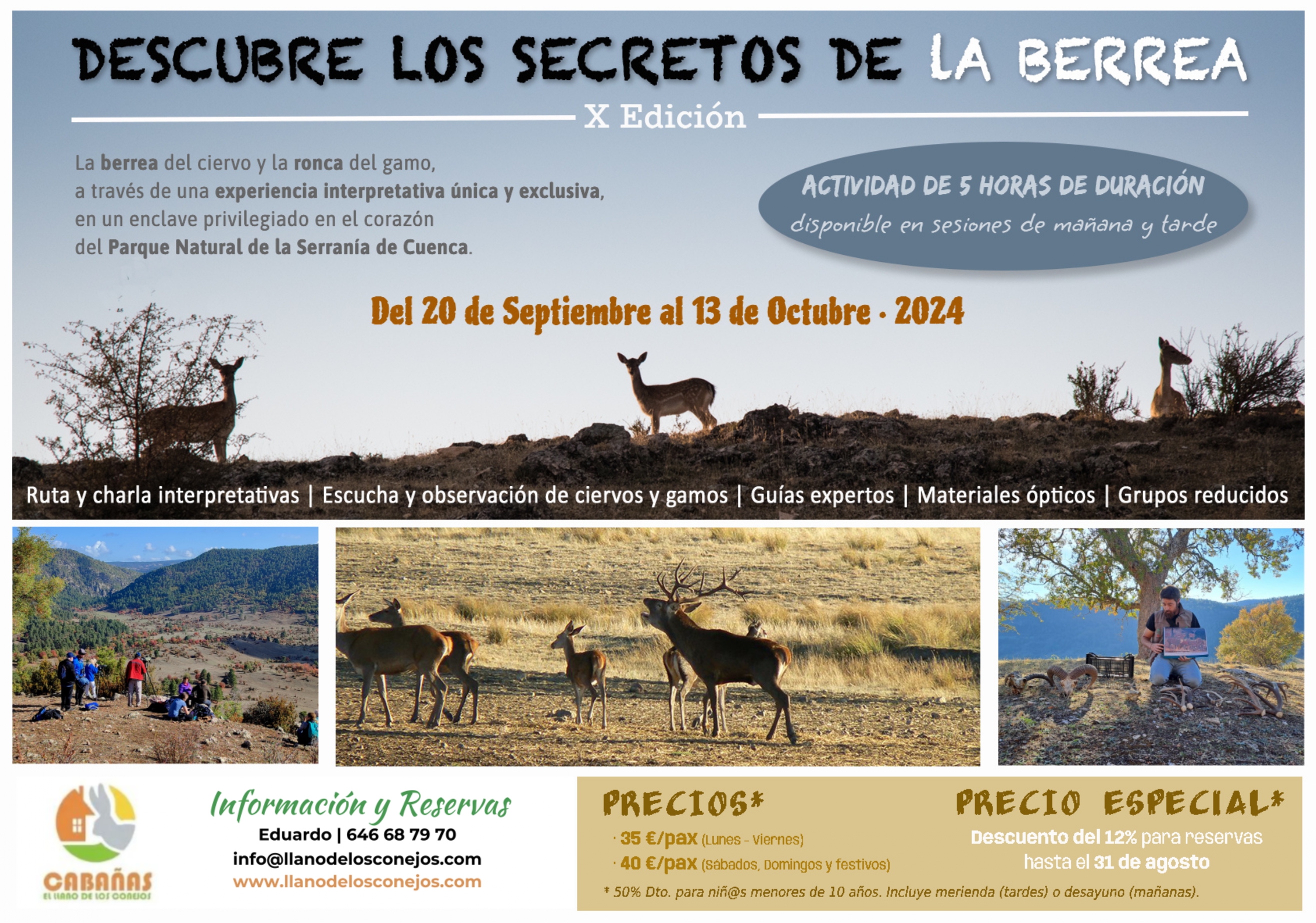 En su X Edición en 2024, llega “Descubre los secretos de la berrea”, una experiencia vinculada con la observación de fauna silvestre que está enteramente destinada a conocer y disfrutar la berrea del ciervo y la ronca del gamo, en un enclave privilegiado ubicado en el corazón del Parque Natural de la Serranía de Cuenca.